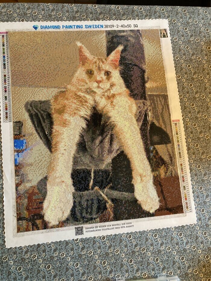 11. "This is a portrait of our cat, made with diamond embroidery (laying out a picture with rhinestones)"