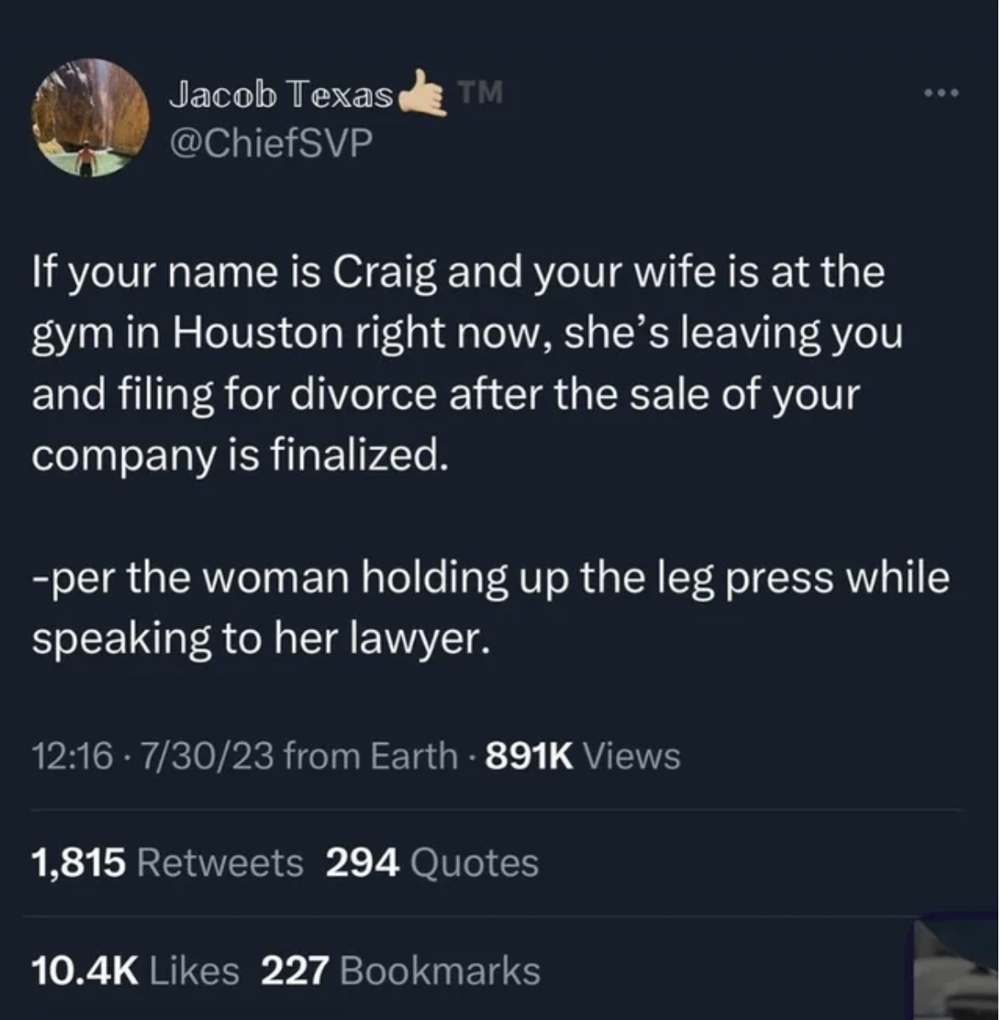 "If your name is Craig and your wife is currently is in a gym in Houston, then she leaves you and serves for divorce after the completion of the sale of your company",