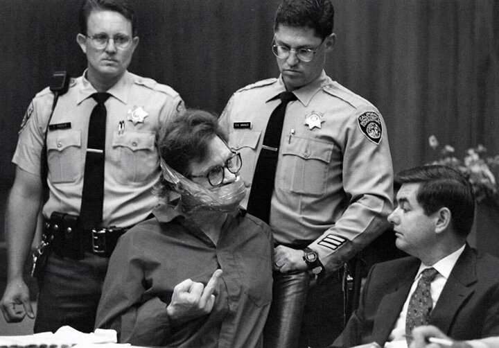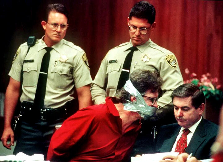 No, these are not stills from a comedy film, but photographs. real trial in 1995. The defendant really they put a gag and taped his face so that he could not speak. But For what? What's going on here anyway?