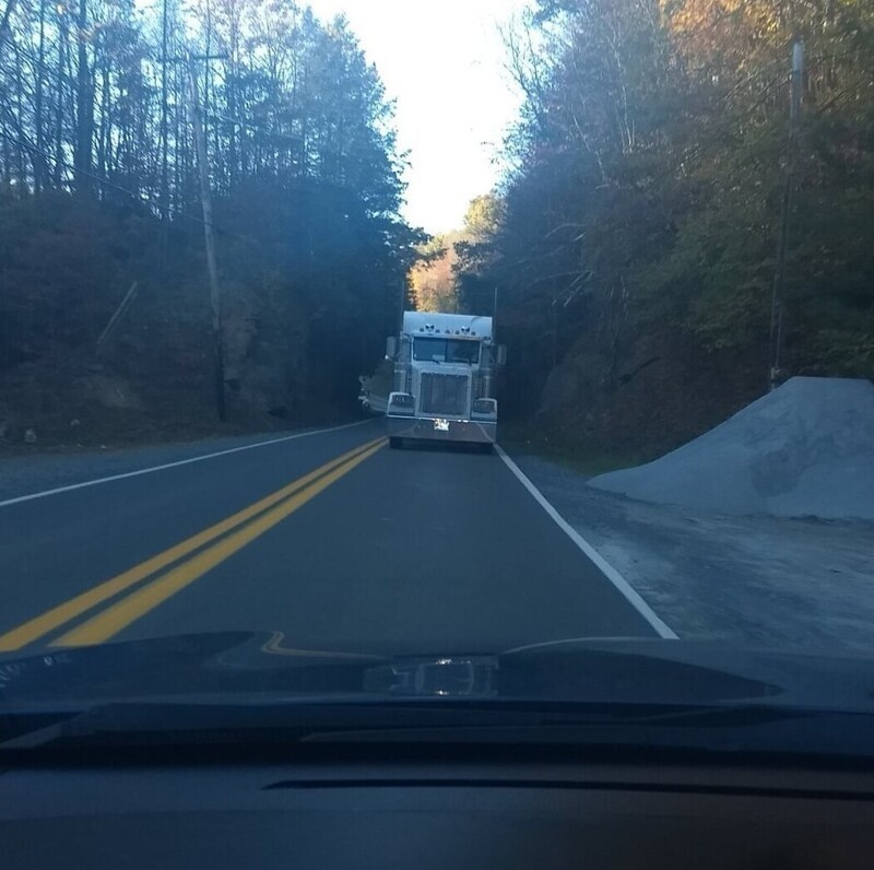 5. I turned onto a mountain road and my heart skipped a beat until I realized that one truck was towing another