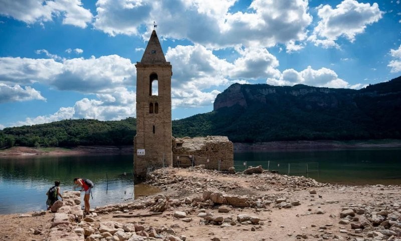 In the northeastern region of Catalonia, receding waters exposed the ruins of an 11th-century church in the flooded village of Sant Roma de Sau. The village went under water in the 1960s when a dam was built nearby. Previously over only the spire rose above the surface, but now even foundation.