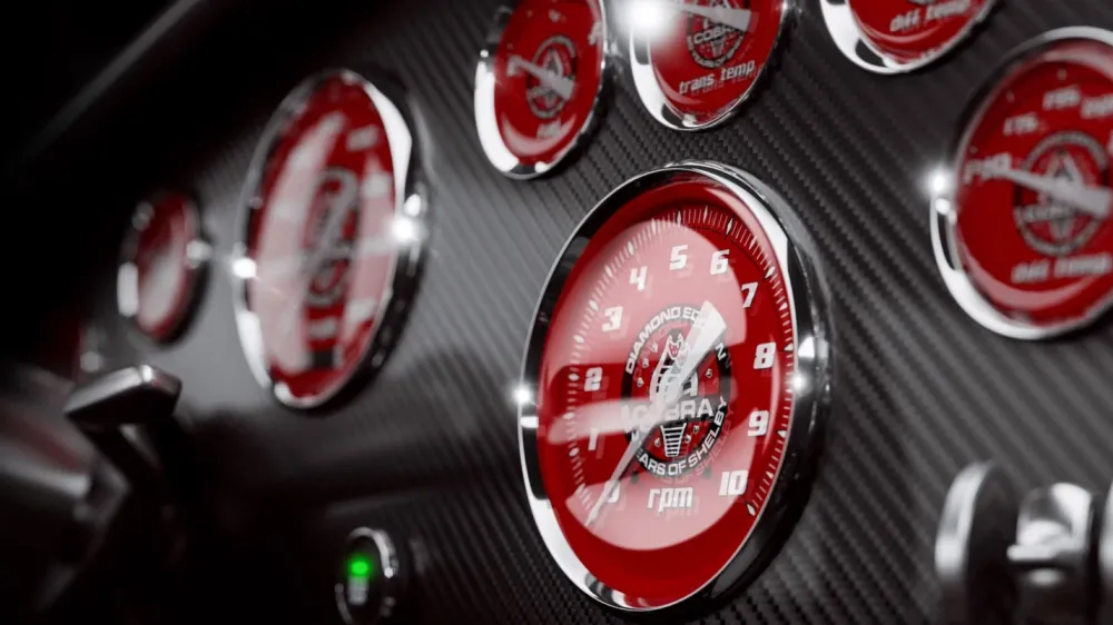 The full name of this car is Diamond Edition 1965 Shelby Cobra is a reference to the Diamond Jubilee of the original Cobra. The roadster received a spatial tubular frame, a carbon fiber body and adjustable racing suspensions with push rods. External panels weighing only 39.9 kg, sports car curb weight, estimated developers, should not exceed 1043 kg. He drives 18" forged rims wrapped in different size tires. Responsible for braking 355mm perforated Baer discs with six-piston calipers in front and four-piston rear.