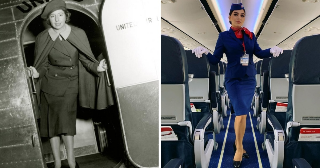 In the photo on the left, the very first flight attendant is Ellen Church, who began her career in 1930.