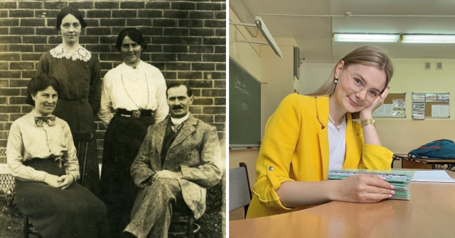 Collective portrait of teachers from one of the New Zealand towns (circa 1910) and a modern teacher.