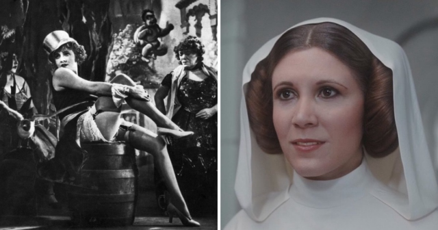 In the first photo - actress Marlene Dietrich, who became a symbol of his era (frame from the 1930 film The Blue Angel). girl on the second photo, Carrie Fisher, is also hard to miss, her image of Princess Leia permanently entrenched in culture.