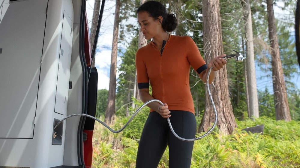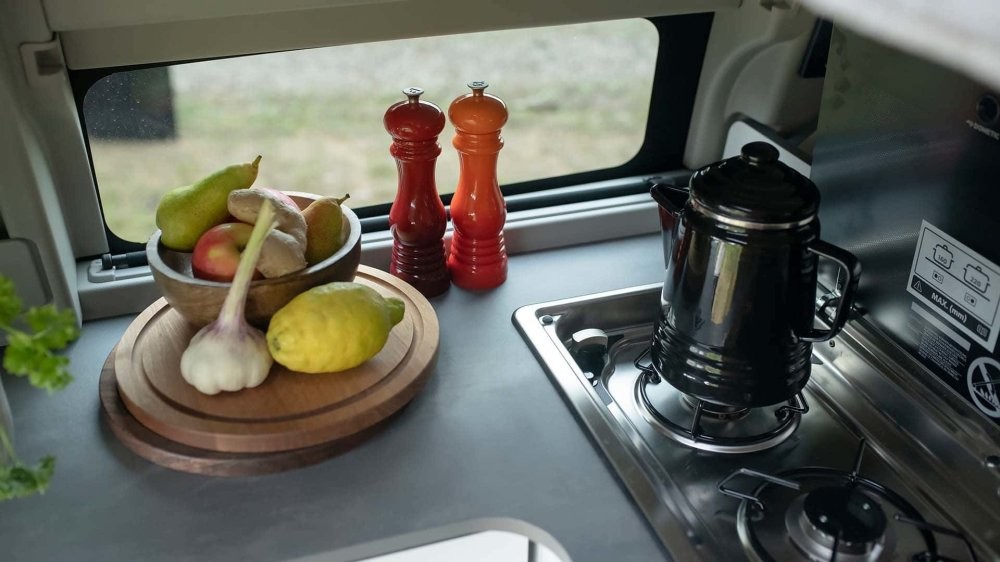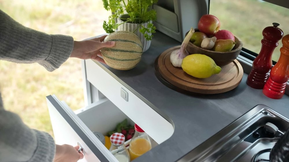 The first is formed due to the ability to deploy the front armchairs 180 degrees facing the folding table (available for a fee extra sofa bed). The second one is standard equipment includes a stove, refrigerator and sink with the possibility of heating water, as well as compartments for storing utensils. More one optional zone - a tent for the fifth door, which can be use as a camp shower.