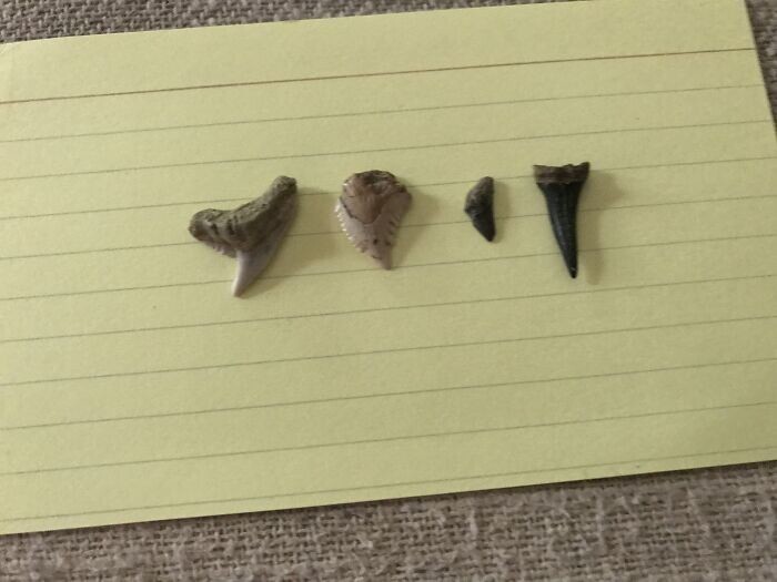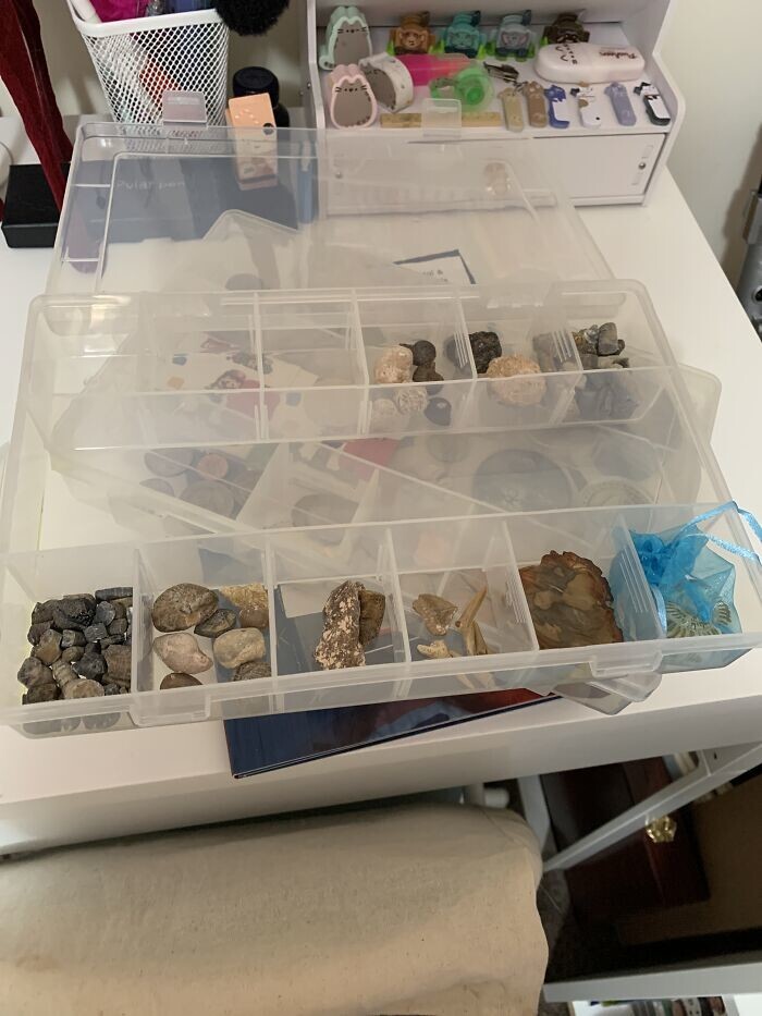 25. “Bottom right is an ammonite, next to it is a fossil tree, next to it are shark teeth, I don’t remember the rest. All authentic!