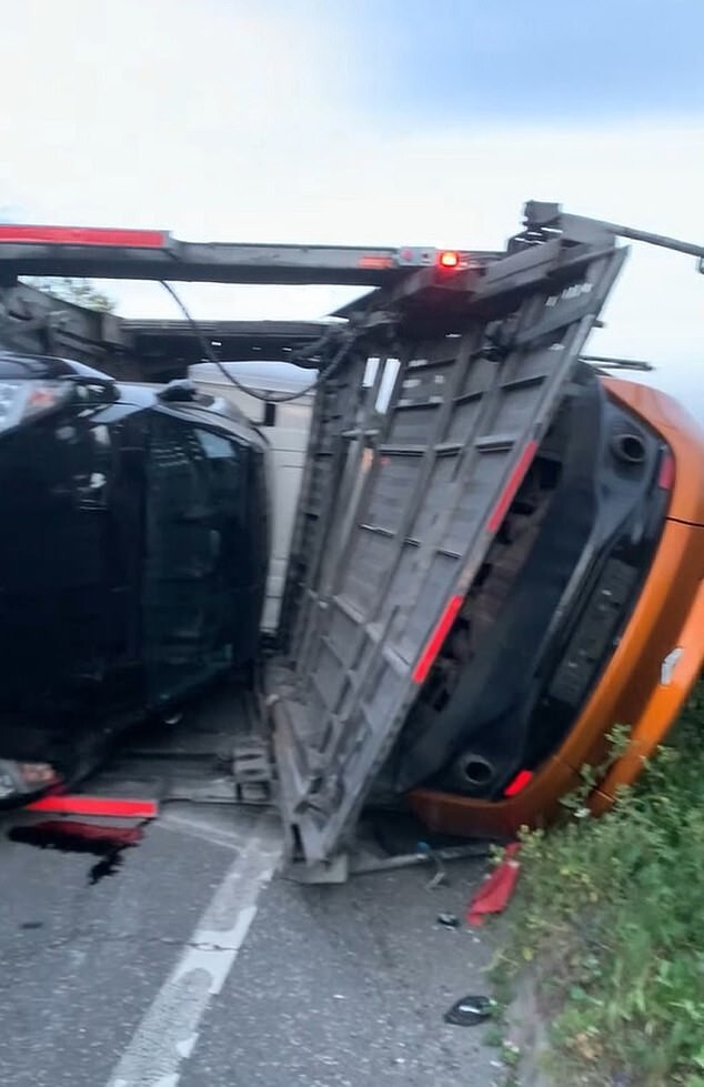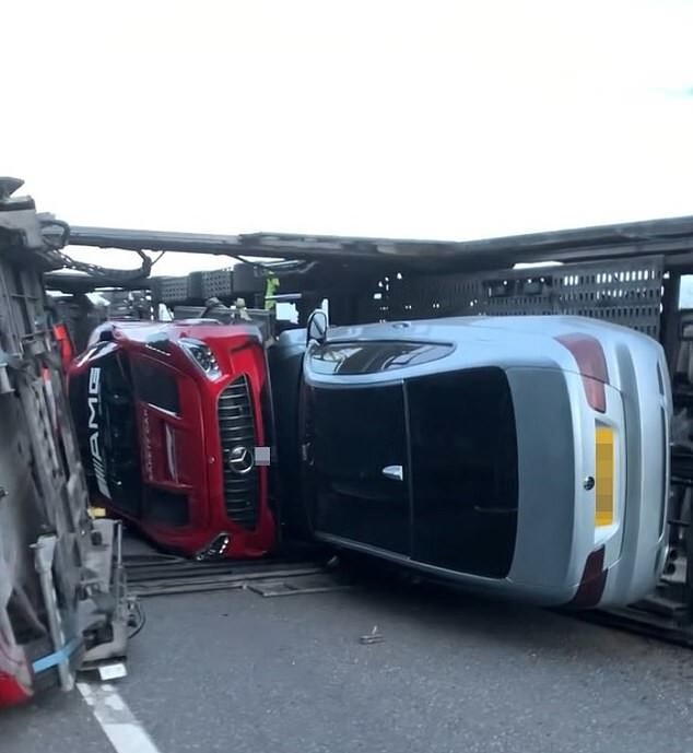 On the evening of August 23, the police drove onto the A20 highway in the area Farningham, Kent, after the accident was reported. Surprisingly, but the driver of the overturned car transporter escaped with only minor injuries. injuries, while luxury Mercedes, Lamborghini, Aston Martin and The BMWs were left in a much worse state.