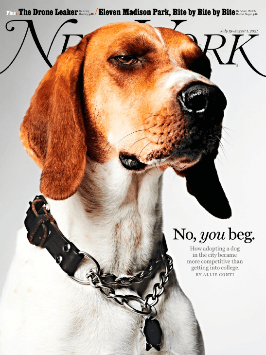 No, it's not some celebrity's dog graces the July issue New York 2021. The fact is that one of the articles in this issue talks about the difficulties of adopting a dog from a shelter during a pandemic.