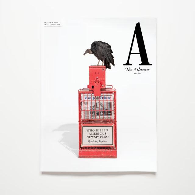 November issue of the socio-political magazine The Atlantic 2021 brings up the subject of the death of print media. Vulture on the cover illustrates this same death.