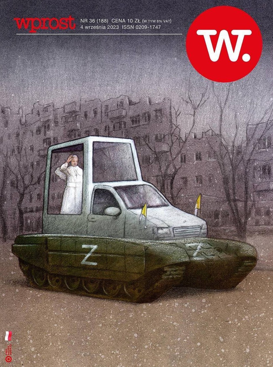 - The Polish edition of Wprost in its new issue depicts Pope Francis' car on the chassis of a Russian armored car.