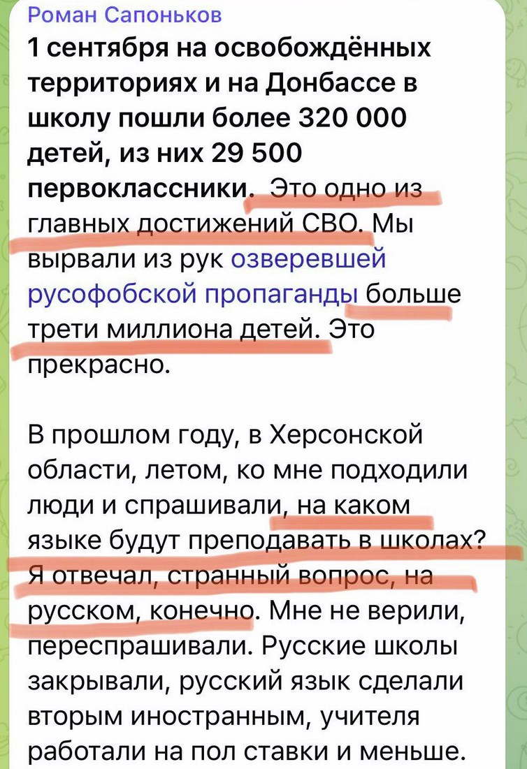 - Russian propagandist Roman Saponkov openly writes that the main achievement of "SVO" - capturing hundreds of thousands of Ukrainian children and turning them into Russians