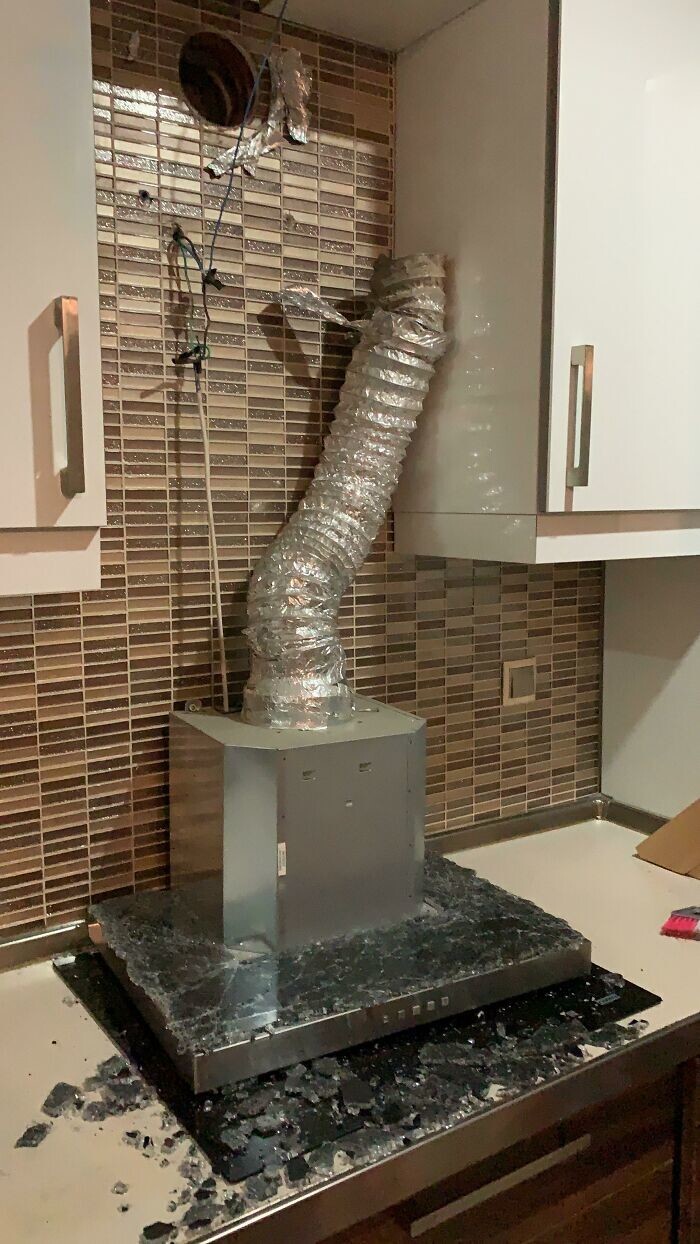 21. “Kitchen cabinet very badly decided to fall on the stove and smash it to smithereens.”