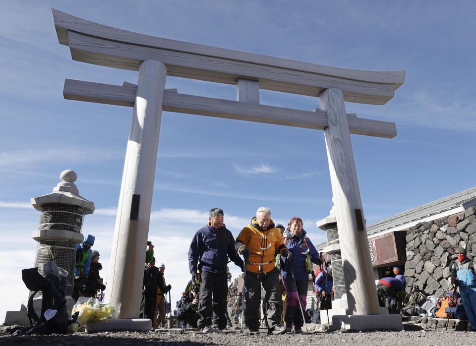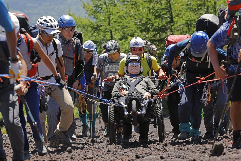 Japan's Yuichiro Miura, now 90, climbs a mountain Fuji. For lifting, he used a specially designed wheelchair for mountaineering.