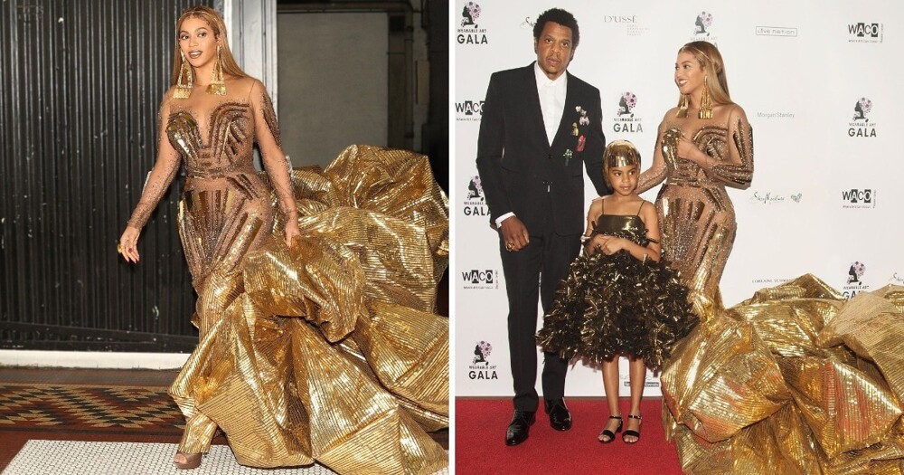 Beyoncé showed up at an event hosted by her mom with her husband and daughter. The outfits turned out very golden!