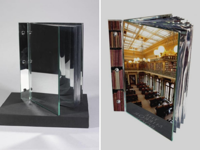 It was published by Circle Press in 1985. Accordingly, the book has no text. It consists entirely of mirror pages made of foil. The book allows you to engage in self-knowledge yourself, because apart from your own reflection, you have nothing else in it you'll see. Interesting philosophical idea.
