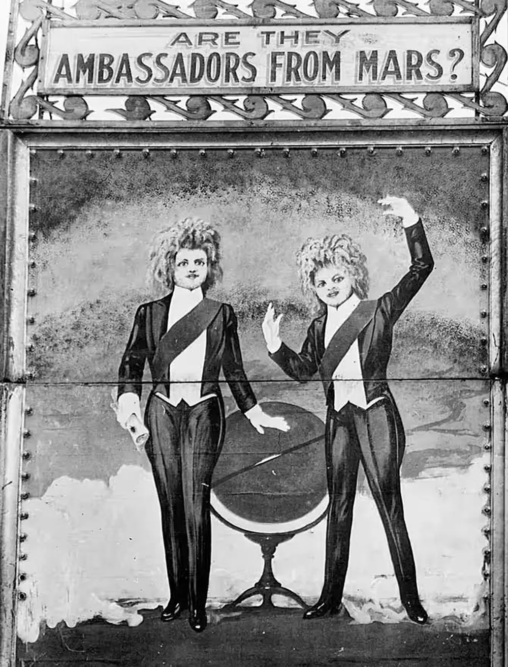 In October 1927, when the circus moved into Roanoke, the brothers Muse was advertised as Messengers from Mars. According to the story, Eko and Iko were discovered in 1923 when they crawled out of a hole near the wreckage spaceship in the Mojave Desert.