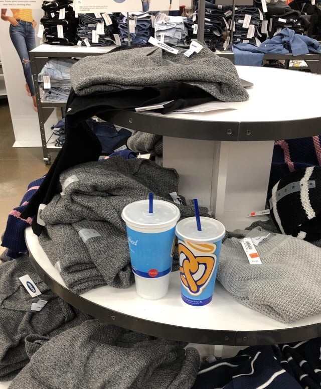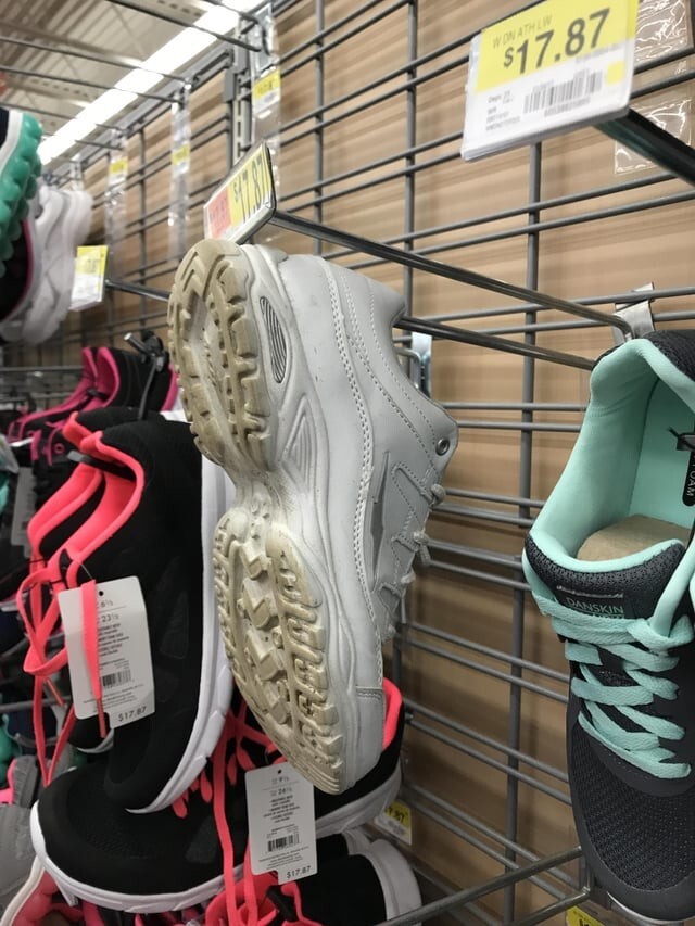 7. In the store, someone just swapped an old pair of shoes for a new one.