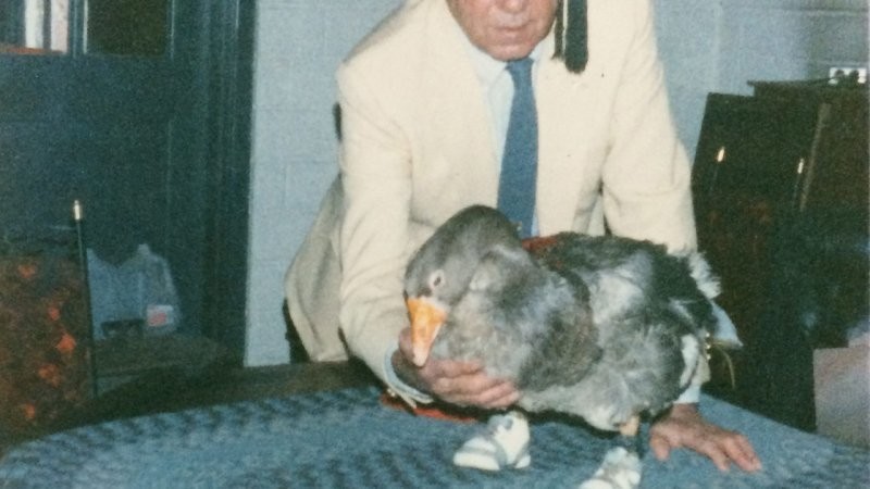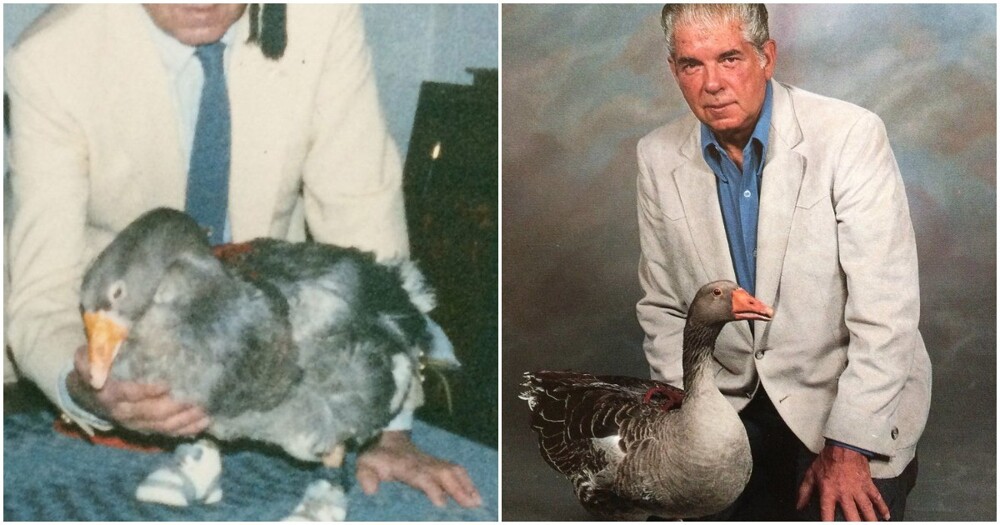 And in 1988, on his daughter-in-law's farm, he met Andy the goose. Unfortunately, the gosling was born with almost no legs and Fleming could calmly watch as he unsuccessfully tried to walk along with his brothers.