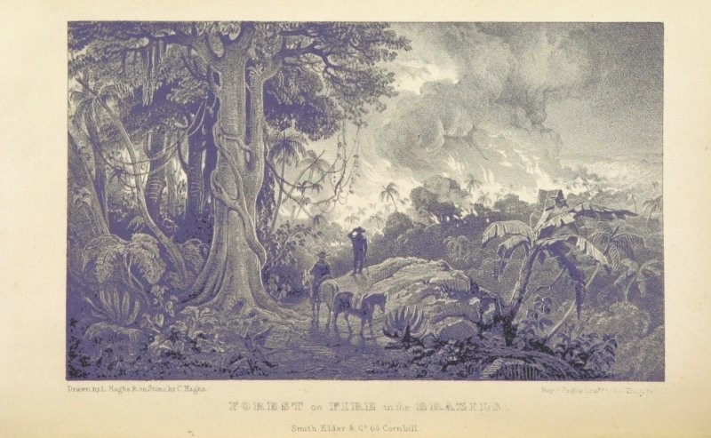 "Forest fire in Brazil." Illustration from James Holman's book about traveling around the world