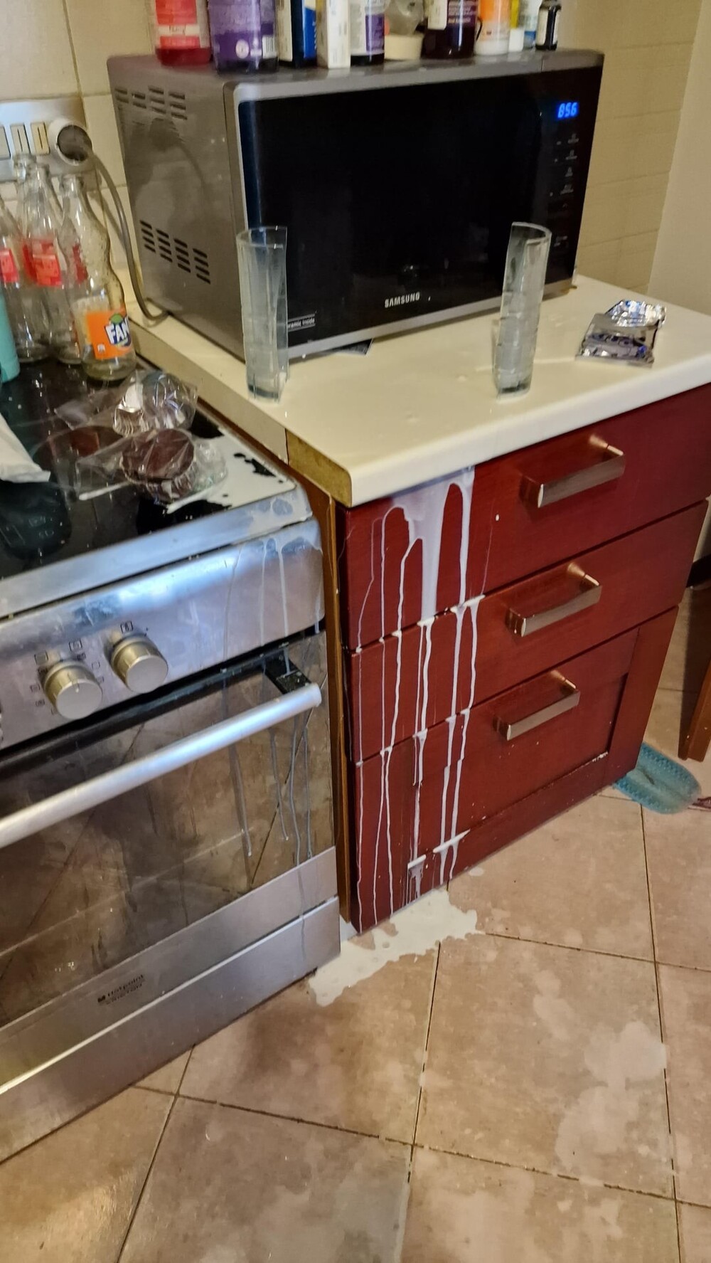 11. Just regular milk perfectly broke the glass into 2 parts, and the milk spilled all over the kitchen