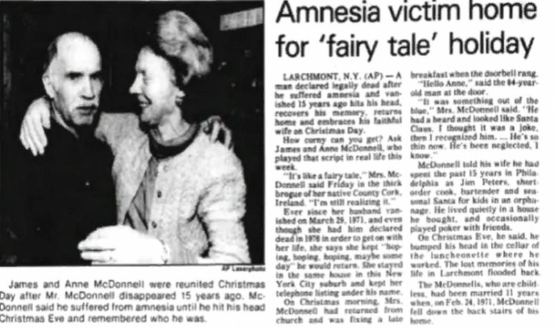 What happened to McDonnell? A man's first memories associated with Philadelphia, which is located at a distance from Larchmont 150 kilometers. He didn't remember anything. The glance came across an advertising real estate agent poster. And the one who lost his memory decided to call himself James Peters, the name of the man on the poster.