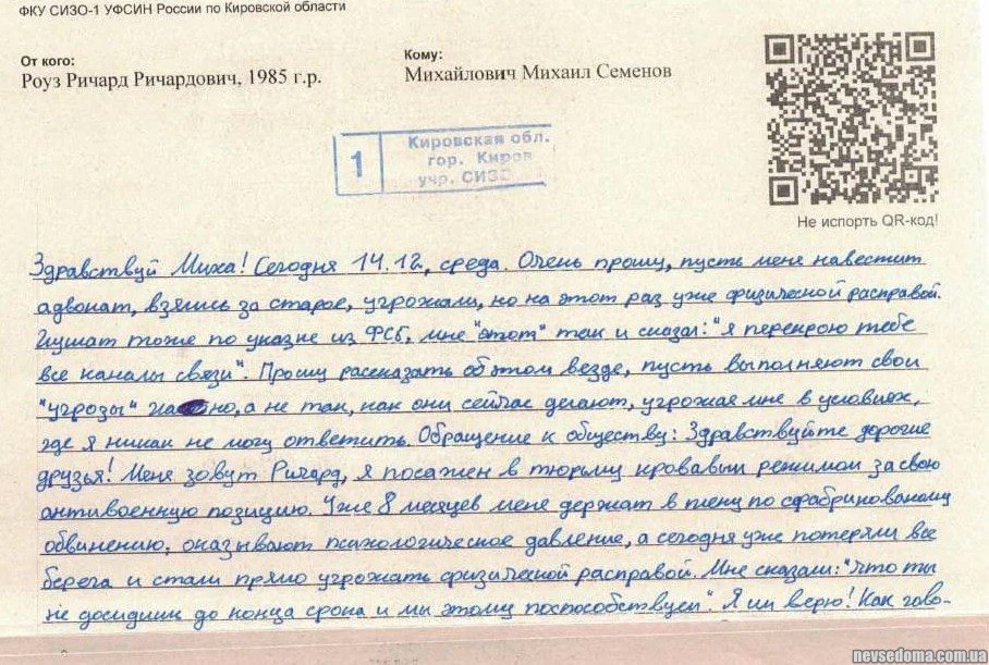 Richard Rose and his wife Maria were detained on April 14 in Kirov and charged with “fakes.” about the army for reposting a video about the events in the Ukrainian Bucha. Later, “incitement to terrorism” was added to this charge against Rose. for a comment on Instagram: “The only way to stop this – kill Putin."
