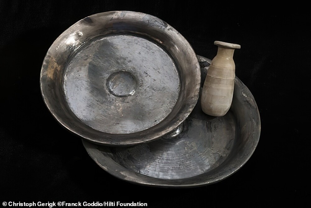 Two silver ritual dishes for libations to the gods from temple treasures. Silver was considered extremely valuable in ancient times Egypt. An alabaster perfume bottle was found nearby.