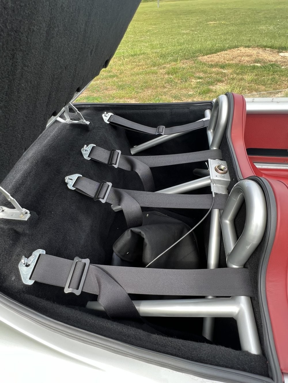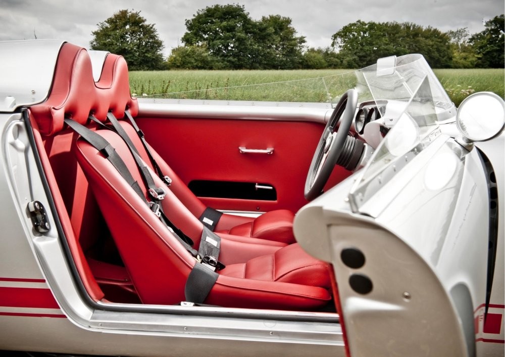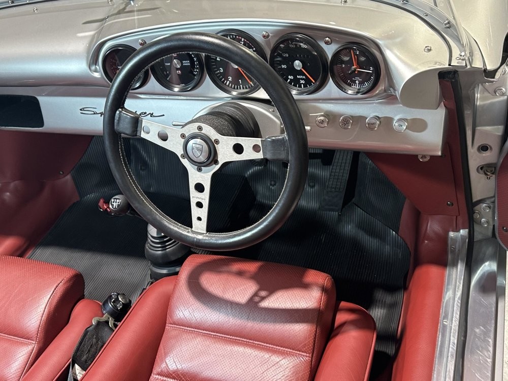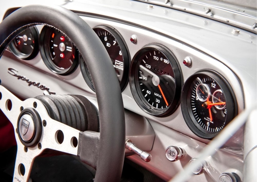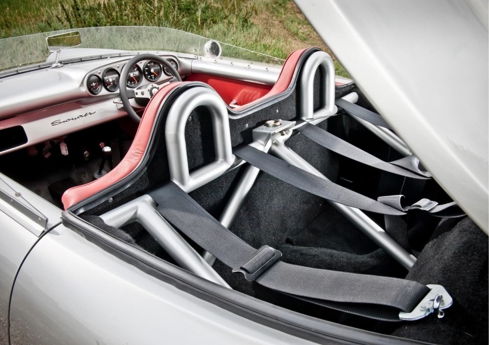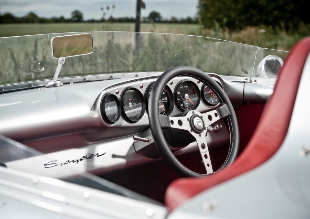 The body-colored dashboard is reminiscent of the Porsche 550 Spyder. The roof and body pillars have been completely removed. All that remains is a small windshield that diverts the incoming air flow from the driver and passenger.