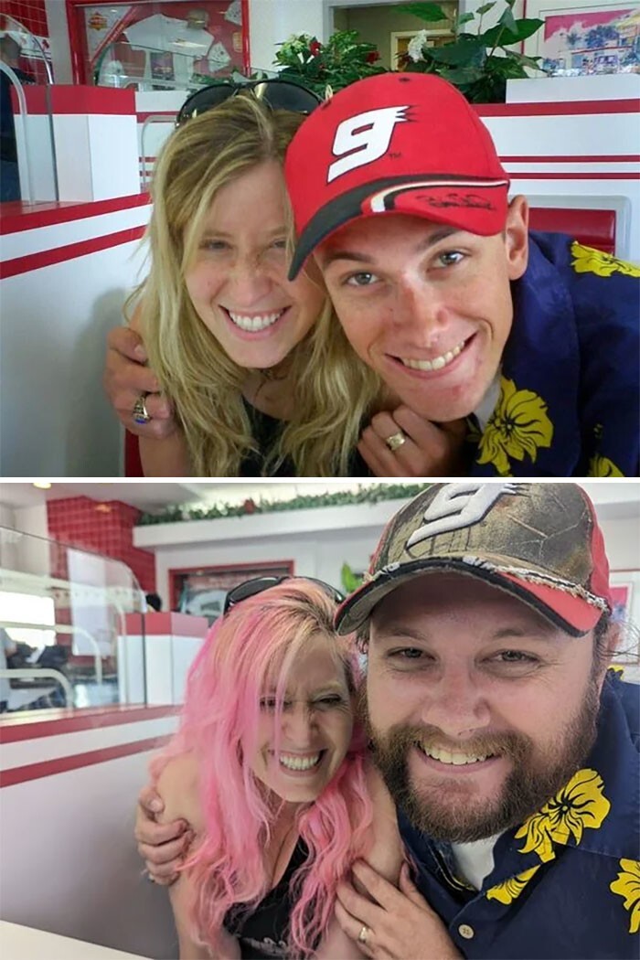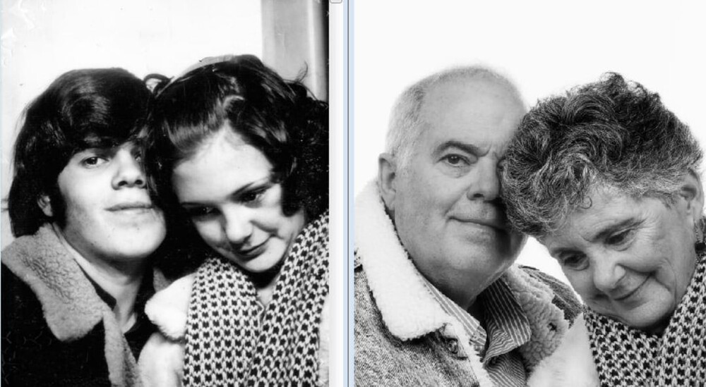 2. “My wife and I in 1973 and in 2019. In the first photo, I had just turned 16 years old. It was our first photo together, taken in a photo booth at the mall.”
