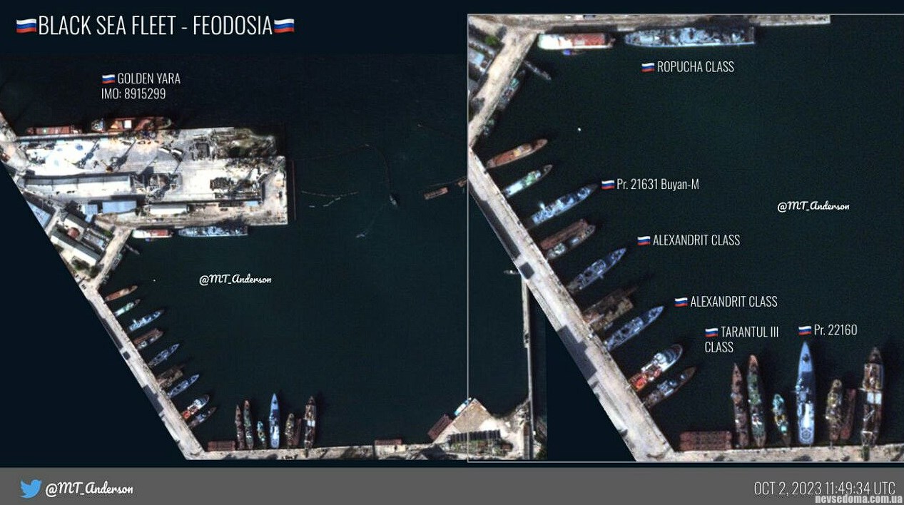 The other part of the ships - one large landing ship, two small missile ships and both new shipsraker of Project 12700 (Alexandrite class) - moved from Sevastopol to Feodosia.
