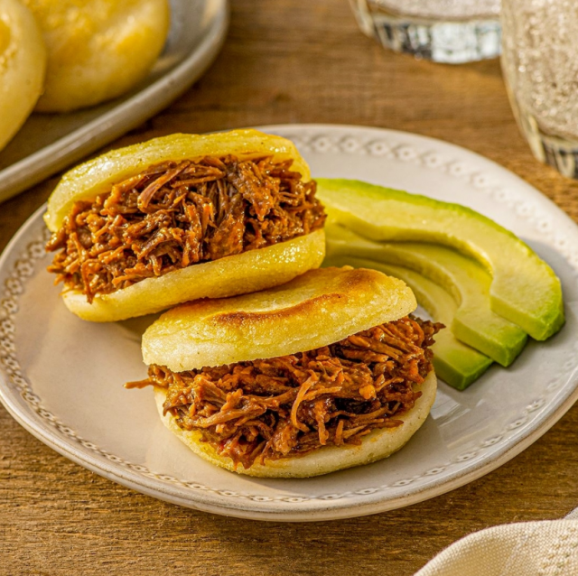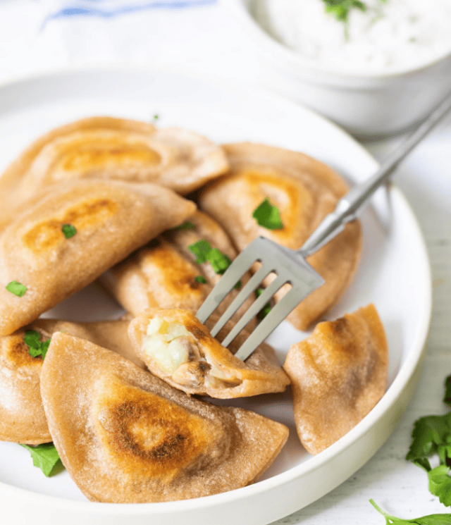 These are flat and round pies made from corn flour. They are cut in half and served with filling.