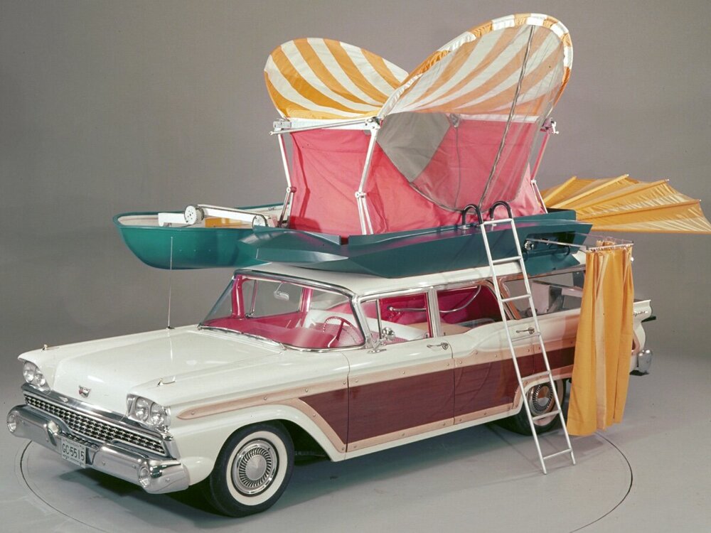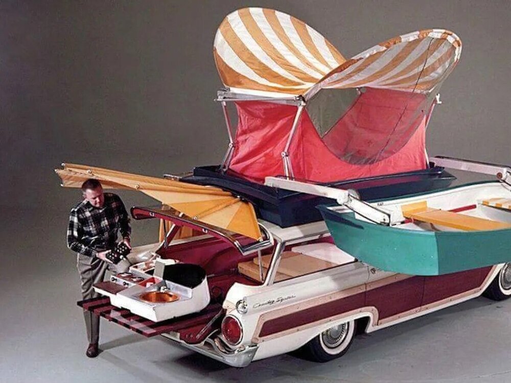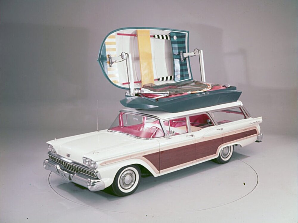 A touring concept of a 1959 Ford Country Squire "folding" station wagon was featured in the July 3, 1958 issue of the Washington Post. The idea is reminiscent of a “Swiss knife” - a trunk on the roof of a car accommodates a boat, tent, canopy, while also being a place for luggage.