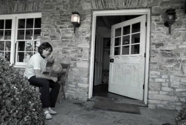Director Roman Polanski sits on his bloodied doorstep after the murder of his pregnant wife, Sharon Tate, by followers of Charles Manson. August 1, 1969