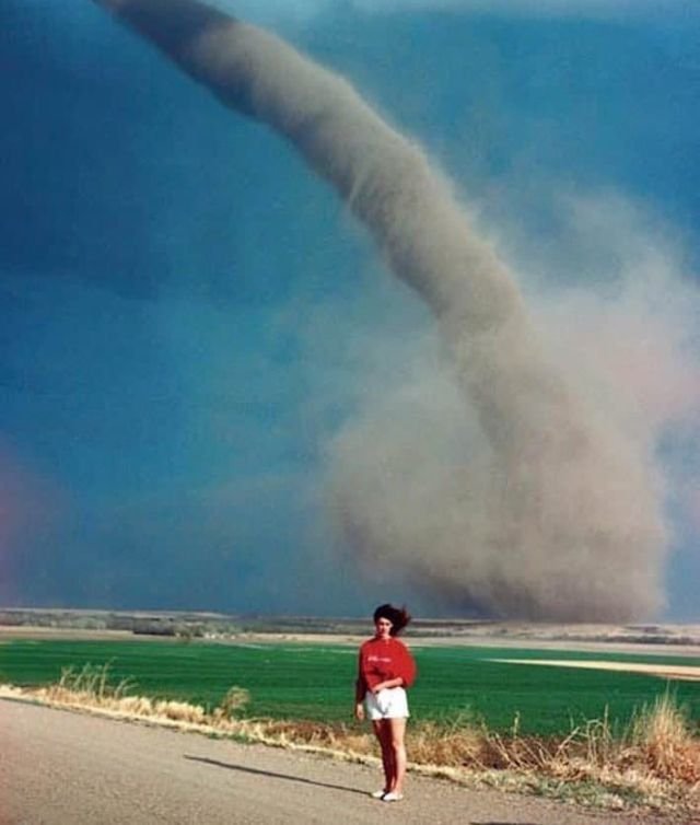 Nebraska girl - Audra Thomas, photographed in front of a tornado, Summer 1989.