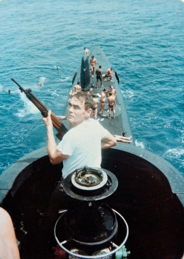 A Brazilian Navy submariner armed with an FN49 rifle protects his colleagues from sharks, January 1985.