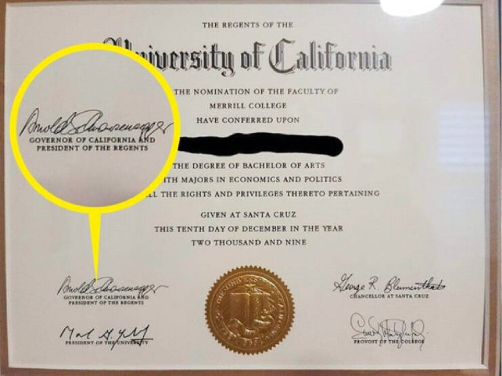 12. “And my bachelor’s degree was signed by Arnold Schwarzenegger himself.”