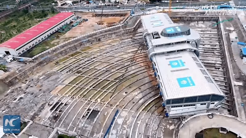 Chinese engineers have set a Guinness World Record by moving a 30,000-tonne bus terminal in Xiamen 288 meters using hundreds of hydraulic jacks and trolleys.