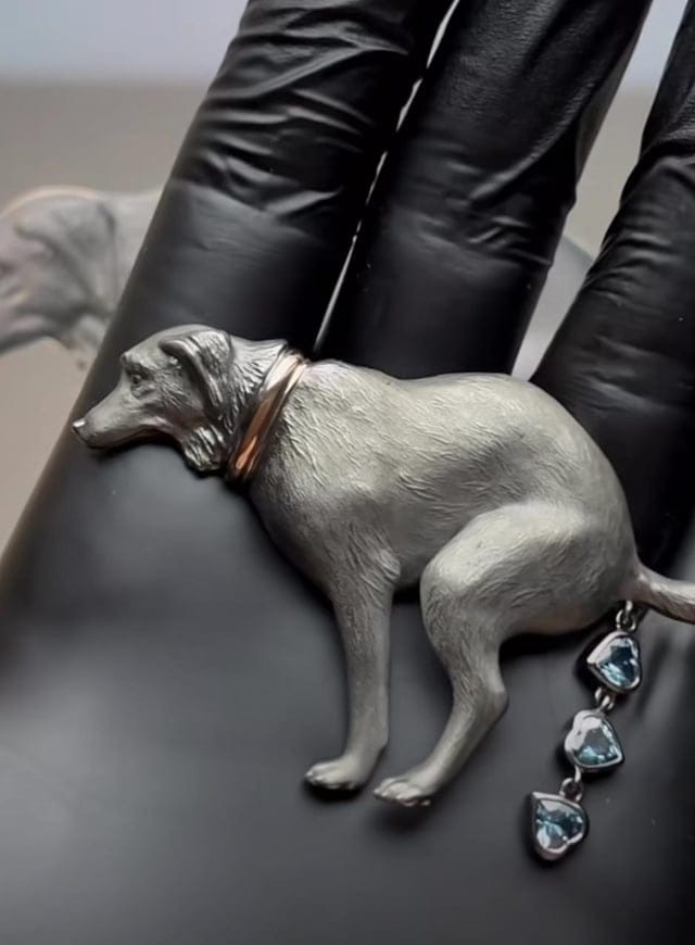 Brooch in the shape of a dog pooping with hearts