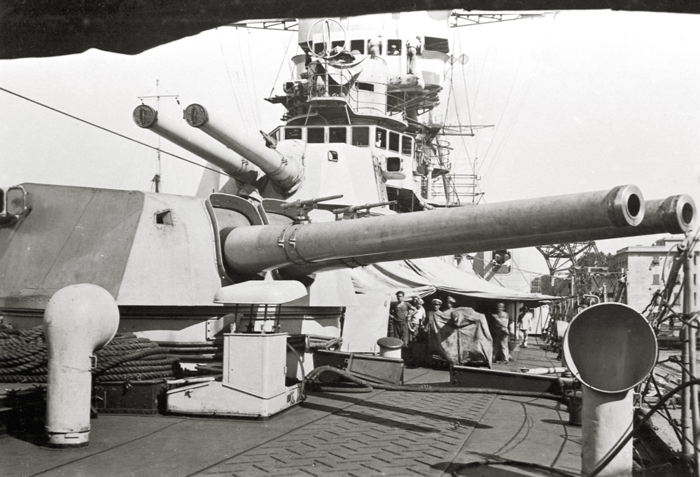 Like all “Washington” cruisers, “Trento” and “Trieste” received 8-inch guns—the maximum allowed under the treaty. Each cruiser carried 8 guns in two-gun turrets arranged in a linearly elevated pattern. The towers had a firing angle of 300 degrees. At a maximum elevation angle of 45°, the firing range reached 31 km.