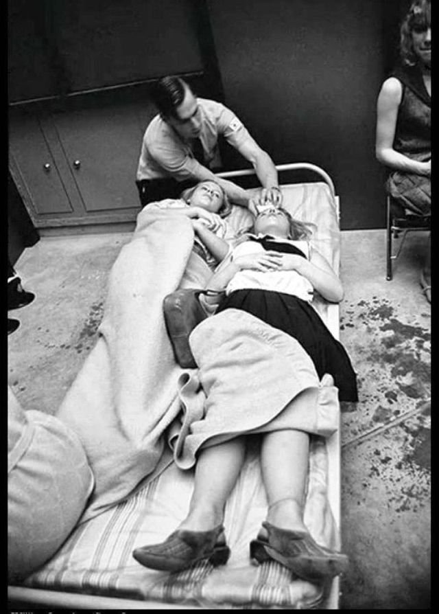 A doctor treats overexcited female fans during a Beatles concert, USA, 1964.
