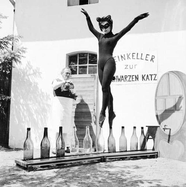 17-year-old Bianca Passarguet from Hamburg dances on wine bottles in a cat costume, 1958.
