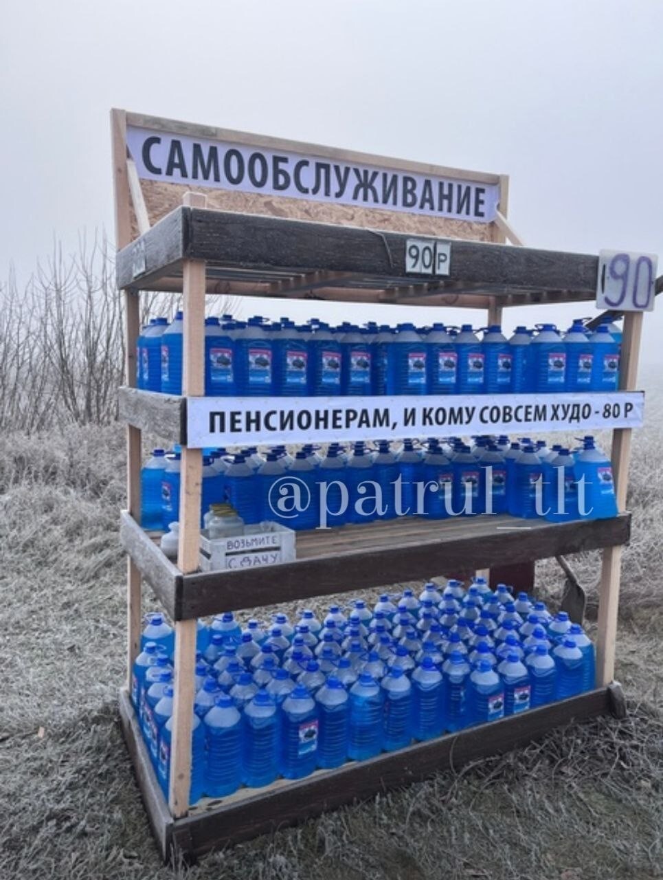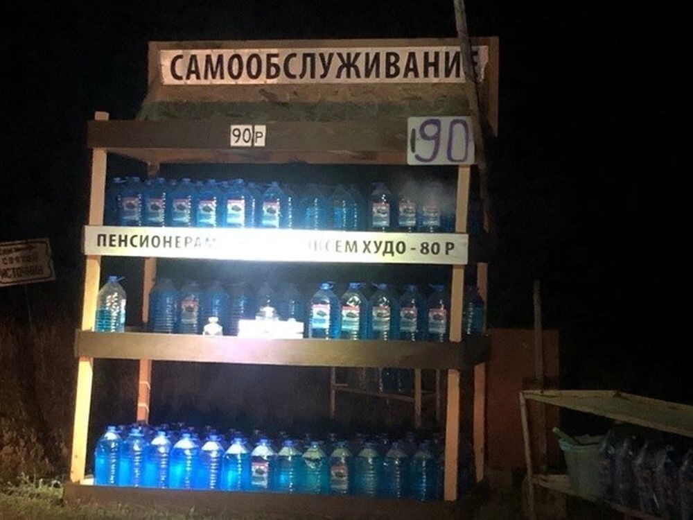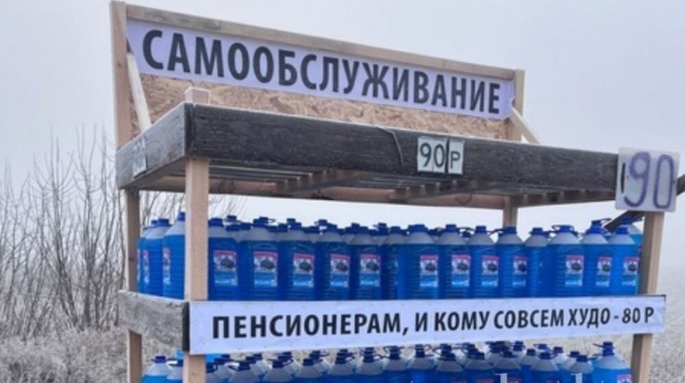 At the turn of the village of Piskali in the Samara region, a self-service point has appeared for motorists where there is no salesperson. Not far from the road there was a rack with bottles of non-freezing liquid. The sign read: “Self service. 90 rub. For pensioners and those who are in very bad shape - 80 rubles.” Also on the shelf there is a container for money and a box with the inscription: “Take change.”