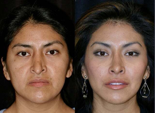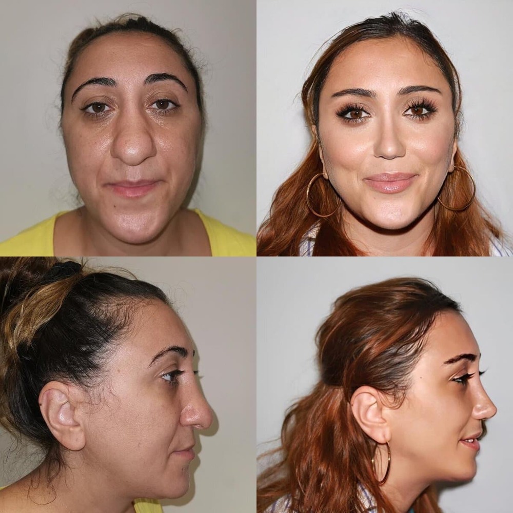Before and after rhinoplasty, chin implantation and cheek fat removal