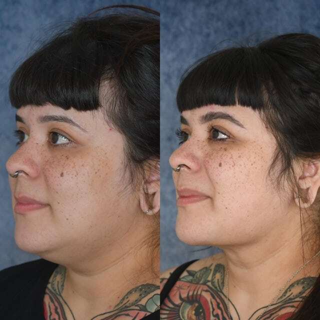 Girl after revision rhinoplasty, temporal cheek lift and bischectomy