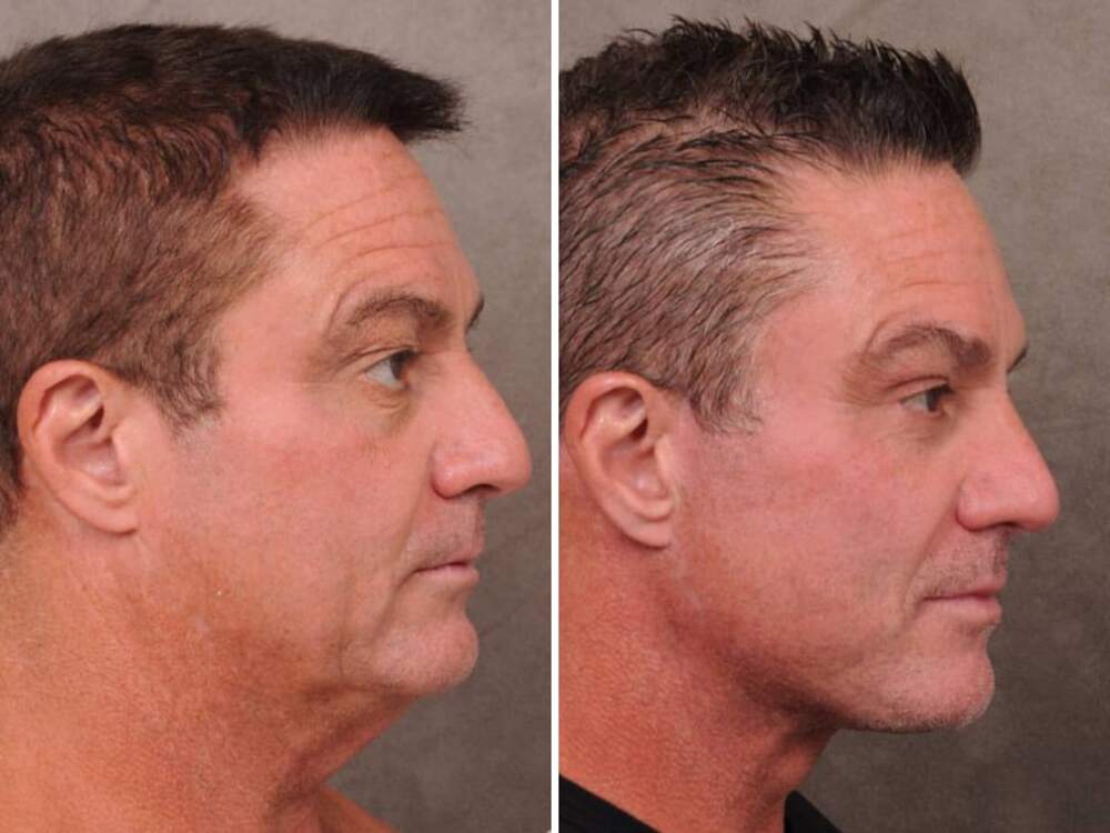 This result was achieved thanks to multiple procedures. Upper/lower blepharoplasty, cheek implantation, forehead contouring, jaw contouring, rhino/septoplasty, lip lift, neck liposuction and hair transplant were performed.