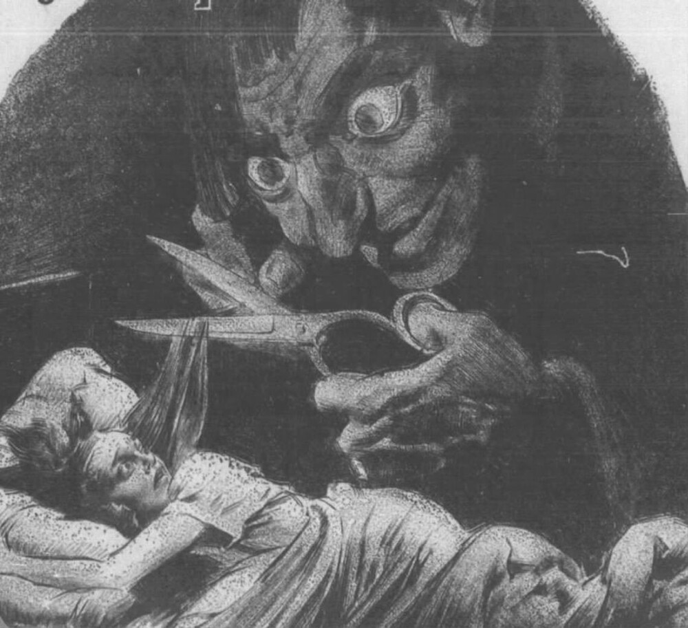At night, June 15, the maniac snuck into Mrs. Taylor's room. In the morning she first saw a cut mesh on the window, and rushing to the mirror she discovered that part of her curls had disappeared.