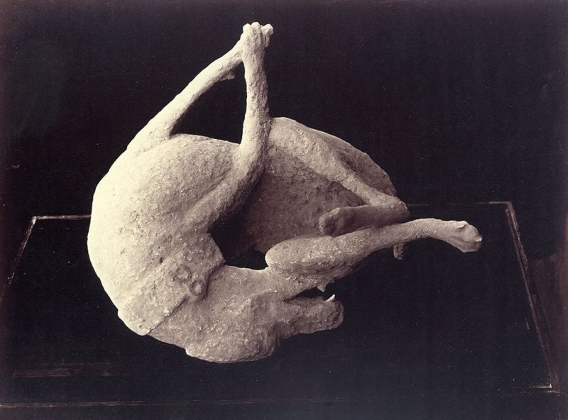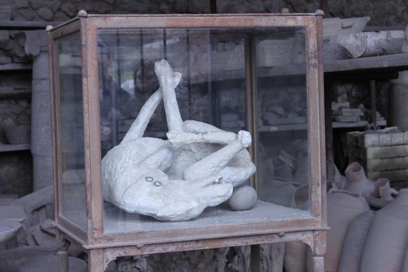This plaster cast depicts a dog that died during the eruption of Mount Vesuvius in Pompeii in 79 AD. Judging by the spikes on the collar, the dog was a guard dog and kept his now meaningless watch until the last seconds of his life. Where he died.