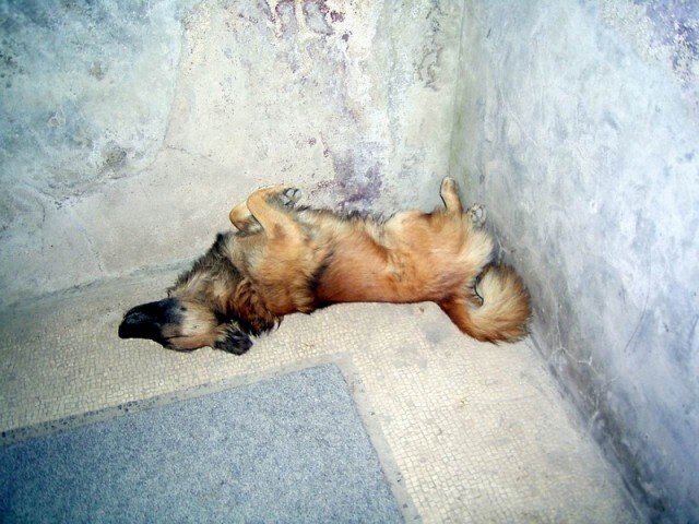 After the eruption began, people began to panic. It is clear that they were not concerned about the fate of the animals, saving their own lives. As long as the length of the chain allowed, the dog climbed up, afraid of being buried under the ashes. Judging by his specific position, he died from asphyxia. The guard was strangled by his own chain, from which he tried to free himself, shaking in convulsions.