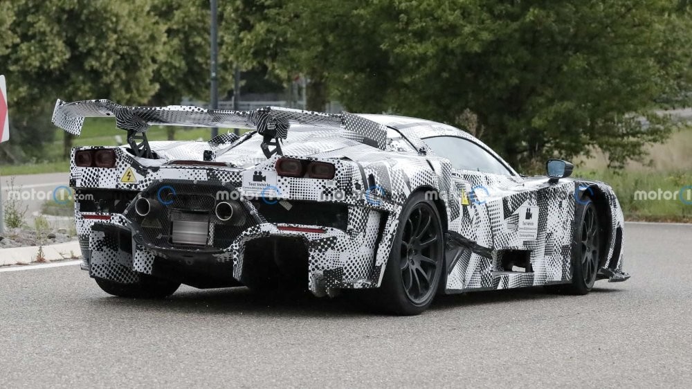 The pair of round exhaust tips protruding from the center of the rear bumper are fake because the exhaust system itself is hidden behind a mesh. The rear view camera, located above the third brake light, is unlikely to remain there on the production car, as it can be assumed that it would be better integrated into the body. The massive rear diffuser gives the hypercar an intimidating appearance, as does the massive front splitter attached to the bumper, which lacks air intake covers.